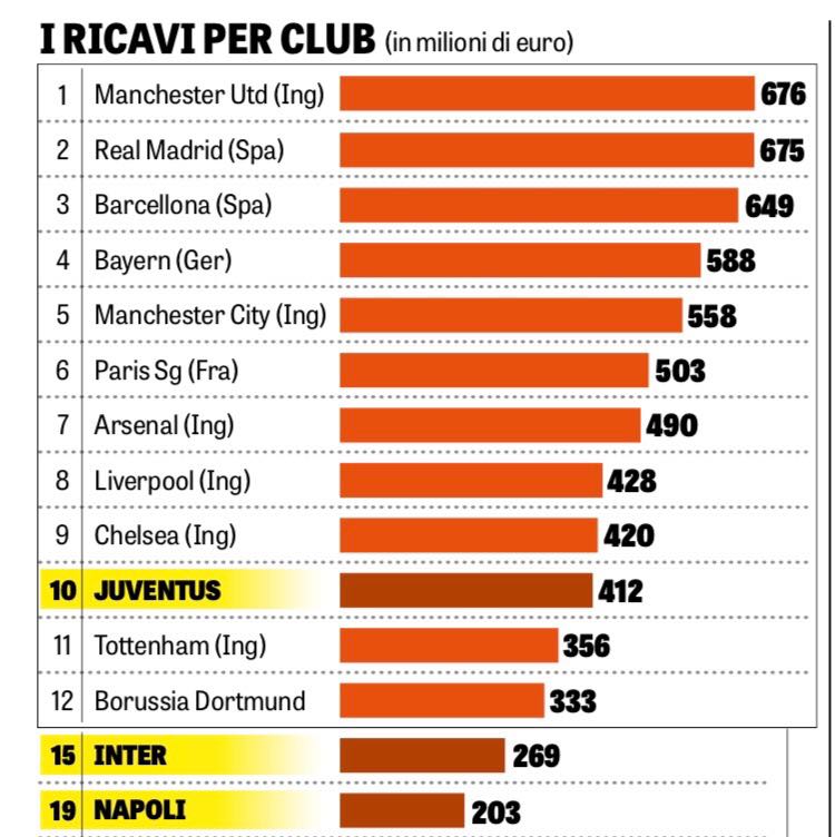 Ad anticiparne i risultati è l’edizione odierna della Gazzetta dello Sport. In particolare, il dossier evidenzia la presenza di 12 top club, che tra sponsor e commerciale fatturano 1,6 miliardi, ovvero il 65% del totale. L’unica italiana tra queste è la Juventus, ma ne troviamo altre due in top 20: si tratta di Inter (15esima) e Napoli (19esimo).