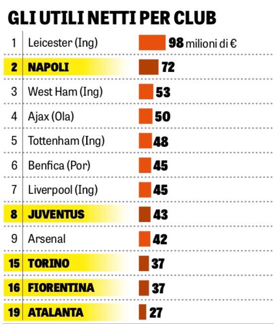 Gli azzurri, inoltre, si rivelano la migliore tra le italiane in fatto di utile netto: il club di De Laurentiis occupa la seconda posizione in questa speciale classifica, alle spalle del Leicester.