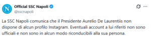 “La SSC Napoli comunica che il Presidente Aurelio De Laurentiis non dispone di alcun profilo Instagram. Eventuali account a lui riferiti non sono ufficiali e non sono in alcun modo riconducibili alla sua persona”