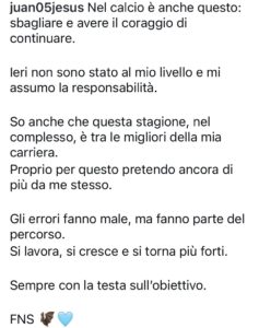 Dopo l’errore costato il gol a Parma J Jesus non si nasconde ma parla attraverso un post Instagram ai tifosi