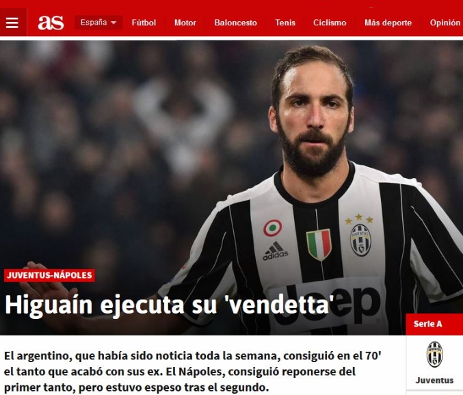 In Spagna il più importante quotidiano sportivo, “AS”, apre così: “Higuaín ejecuta su ‘vendetta’ – El argentino, que había sido noticia toda la semana, consiguió en el 70′ el tanto que acabó con sus ex. El Nápoles, consiguió reponerse del primer tanto, pero estuvo espeso tras el segundo” (Higuaín compie la sua ‘vendetta’ – L’argentino, che era stato citato in ogni news tutta la settimana, ha segnato al 70 ‘il gol che ha affondato la sua ex squadra. Il Napoli è riuscito a recuperare il primo gol, ma non è riuscito a recuperare il secondo”).