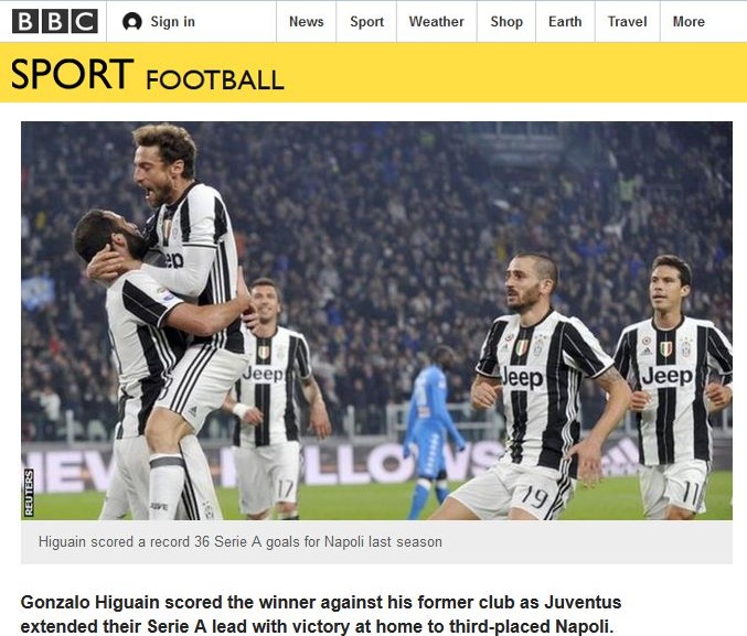 Infine negli Stati Uniti anche la BBC commenta in modo similare la vittoria: “Gonzalo Higuain scored the winner against his former club as Juventus extended their Serie A lead with victory at home to third-placed Napoli” (“Gonzalo Higuain segna e vince contro la sua ex squadra e la Juventus aumenta il suo vantaggio in Serie A con la vittoria in casa contro il Napoli terzo in classifica”).