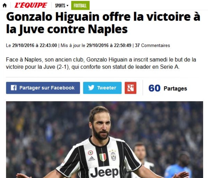 In Francia il prestigioso “L’Équipe” titola “Gonzalo Higuain offre la victoire à la Juve contre Naples” (“Gonzalo Higuain regala la vittoria alla Juventus contro il Napoli”), poi aggiunge nel commento: “Face à Naples, son ancien club, Gonzalo Higuain a inscrit samedi le but de la victoire pour la Juve (2-1), qui conforte son statut de leader en Serie A” (“Scherzo al Napoli, sua ex squadra, Gonzalo Higuain ha segnato sabato il gol della vittoria per la Juve (2-1) che rafforza la sua leadership in Serie A”).