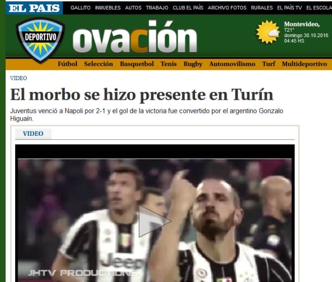 Dall’altra parte del mondo, in Sudamerica, “El País Ovación” titola: “El morbo se hizo presente en Turín” (“La malattia era presente a Torino”). Analizza così la gara nell’occhiello: “Juventus venció a Napoli por 2-1 y el gol de la victoria fue convertido por el argentino Gonzalo Higuaín. El argentino Gonzalo Higuaín fulminó a su anterior equipo y dio la victoria al líder Juventus por 2-1 ante el Napoli, este sábado en el partido estelar de la 11ª jornada de la Serie A” (“La Juventus batte il Napoli 2-1 e il gol della vittoria lo ha segnato Gonzalo Higuaín. L’argentino ha fulminato la sua vecchia squadra e ha regalato la vittoria alla Juventus, un 2-1 al Napoli nella partita principale della 11°giornata di Serie A”).
